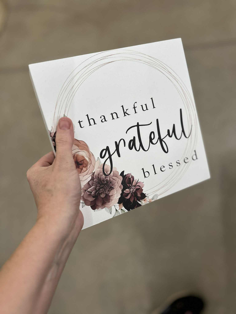 Thankful Grateful Blessed Block Sitter - Sized at 8x8" - a freestanding block sitter.