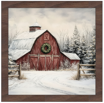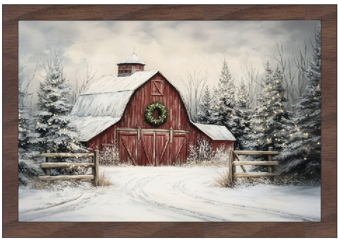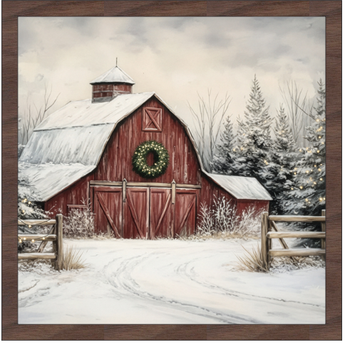 Vintage Snowy Red Barn with Glowing Lights. Available with your choice of Farmhouse Style Frames.