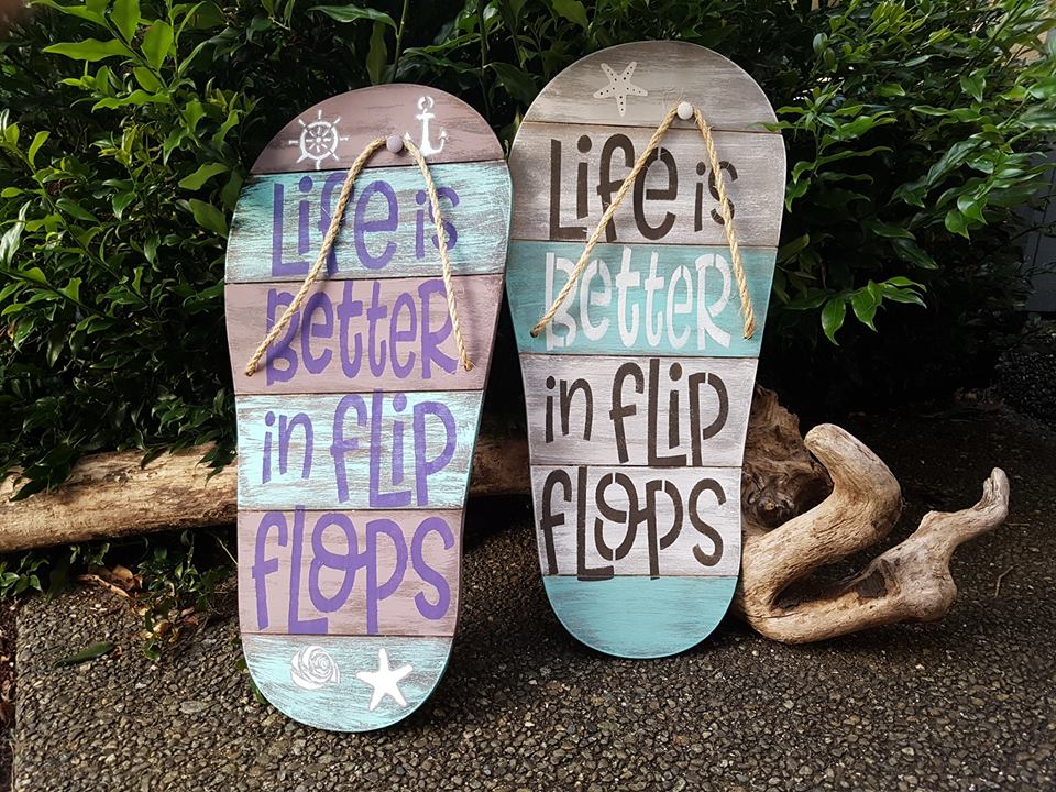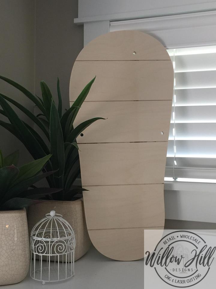 Cut from 1/2" Baltic Birch Plywood or 1/2" MDF, this design is unfinished, but comes sanded and ready for paint/stain. 3 holes will be drilled as per photo. Add your own rope/string/ribbon to complete the flip-flop effect.