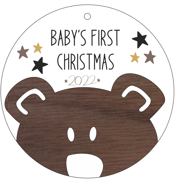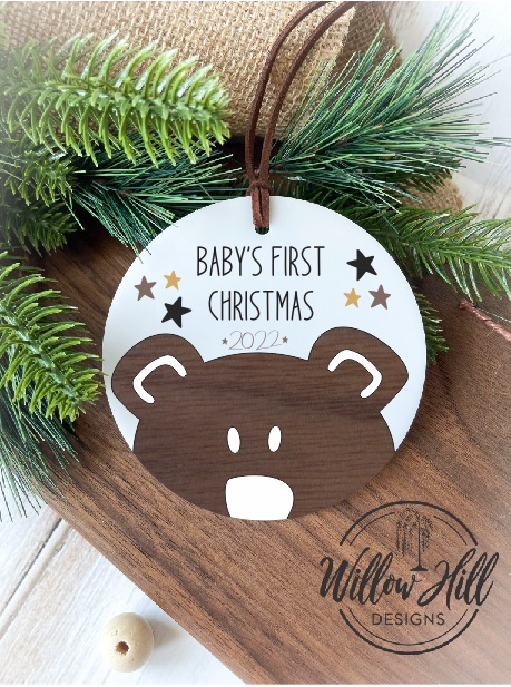 These ornaments are cut from 1/8" white acrylic and printed with permanent ink. Finished with brown or black suede string.