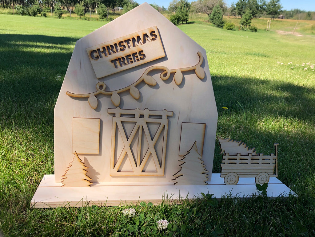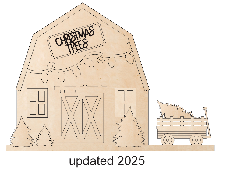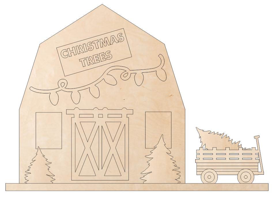 The barn/base are all cut from 1/2" Baltic Birch Plywood OR 1/2" MDF. The accent pieces are all laser cut from 1/8" Baltic Birch Plywood.
