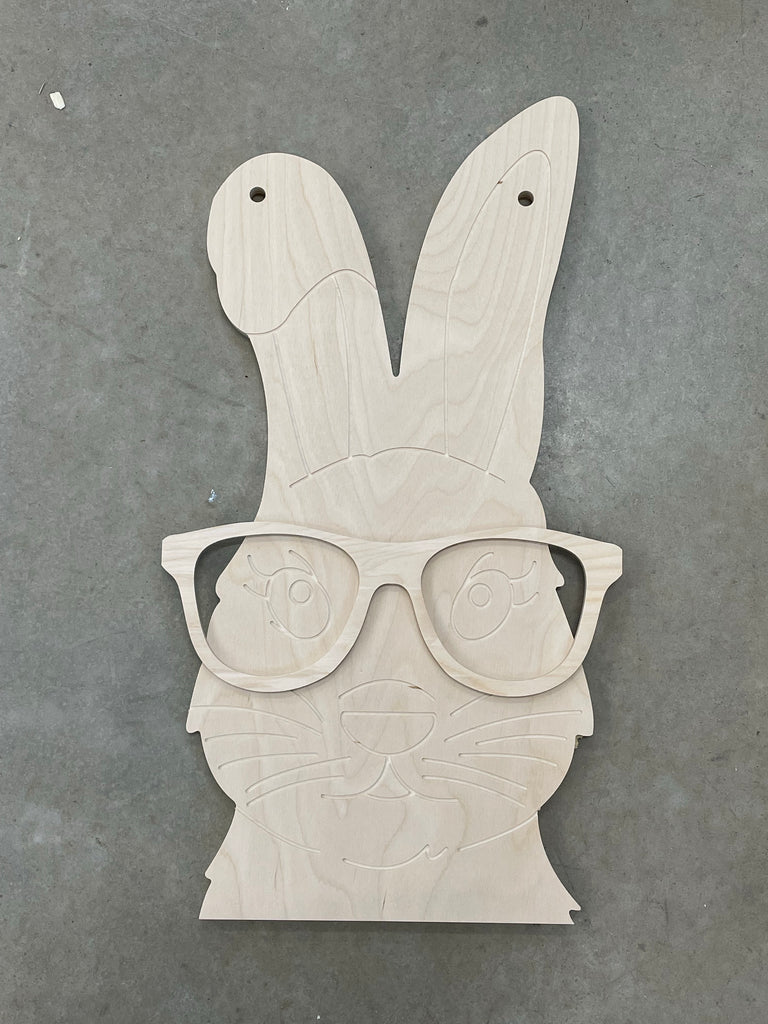 Design is available from Baltic Birch Plywood or MDF. Bunny is cut from 1/2" thickness, glasses are cut from 1/4" thickness. Available with or without Hanger holes.