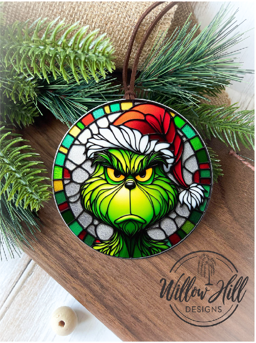 These ornaments are cut from 1/8" clear acrylic and printed with permanent ink. Finished with brown or black suede string. Each ornament is slightly translucent providing a stunning glow when hung in a window or on your tree.