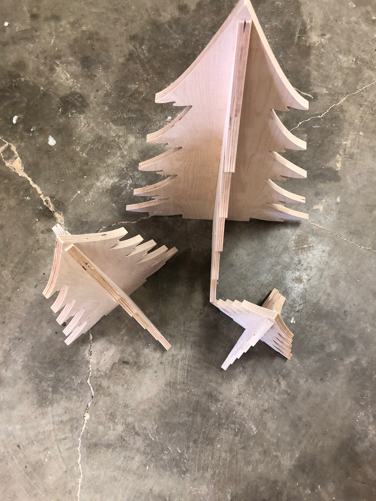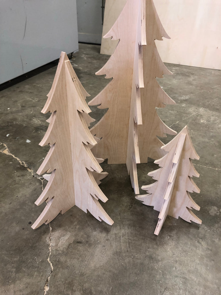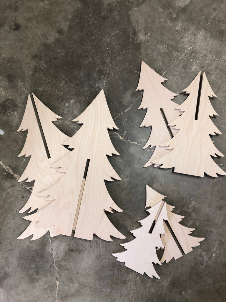 Trees come in 2 pieces, to be slotted together to create the 3-D Standing Effect. Trees come sanded and ready for paint, stain and assembly. We recommend painting them assembled, as paint/stain could cause wood to swell and make them harder to assemble.