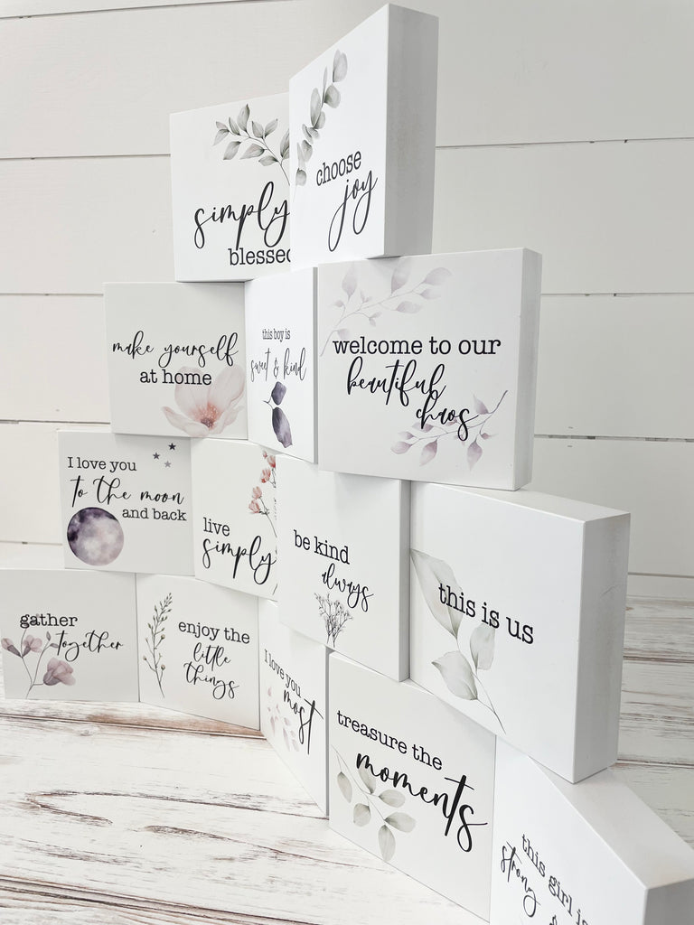 These sweet little shelf sitters are sized at 6x6" in size and are double sided! An easy way to change up your décor without having to buy something new! With high quality watercolour graphics, our designs are neutral, but still elegant and charming - a perfect blend of rustic and contemporary to suit any style. Great for gifting, or keeping for yourself, these are designs you will love to display for years to come!