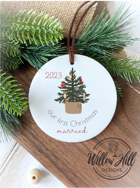 These ornaments are cut from 1/8" white acrylic and printed with permanent ink. Finished with brown or black suede string.