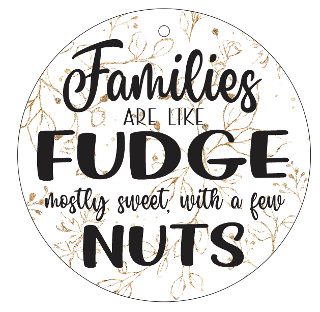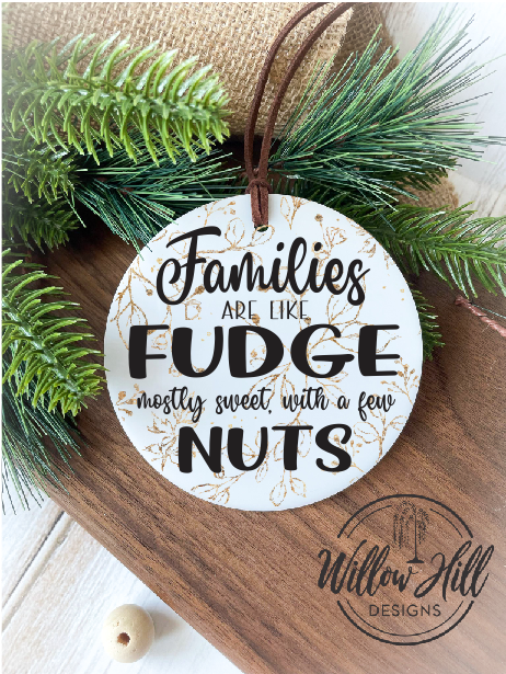 These ornaments are cut from 1/8" white acrylic and printed with permanent ink. Finished with brown or black suede string.
