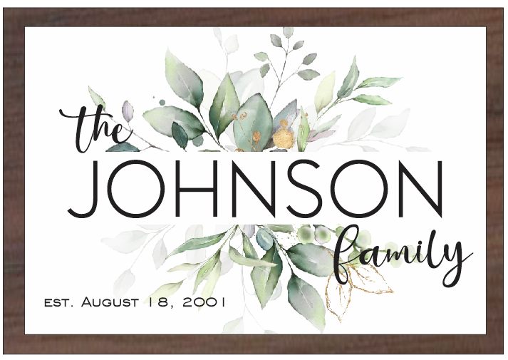 These personalized designs are a great gift for yourself, or a special family in your life! This design includes a mix of 3D and printed lettering on sweet soft neutral greenery graphics.
