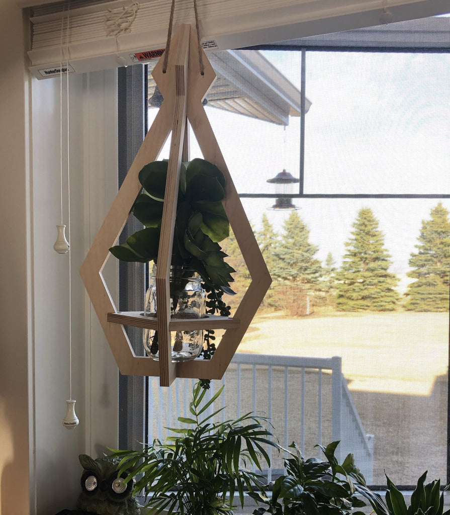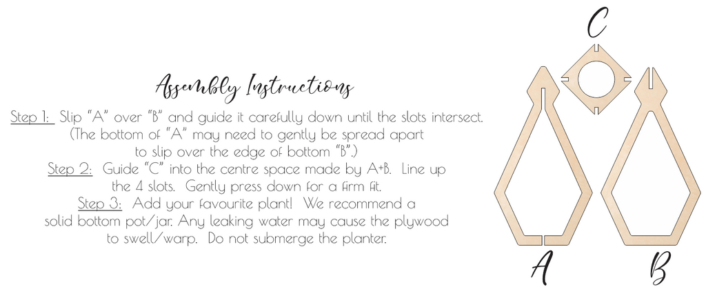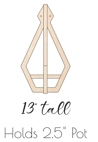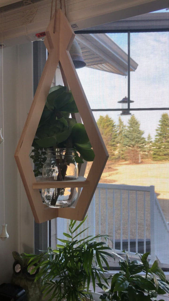 Each planter slips together, and is secured with a centre ring that pressure fits down to hold the cross pieces together snugly. Add a jar, or small pot to the centre, and enjoy! Planter can hang with rope, or sit on it's base.