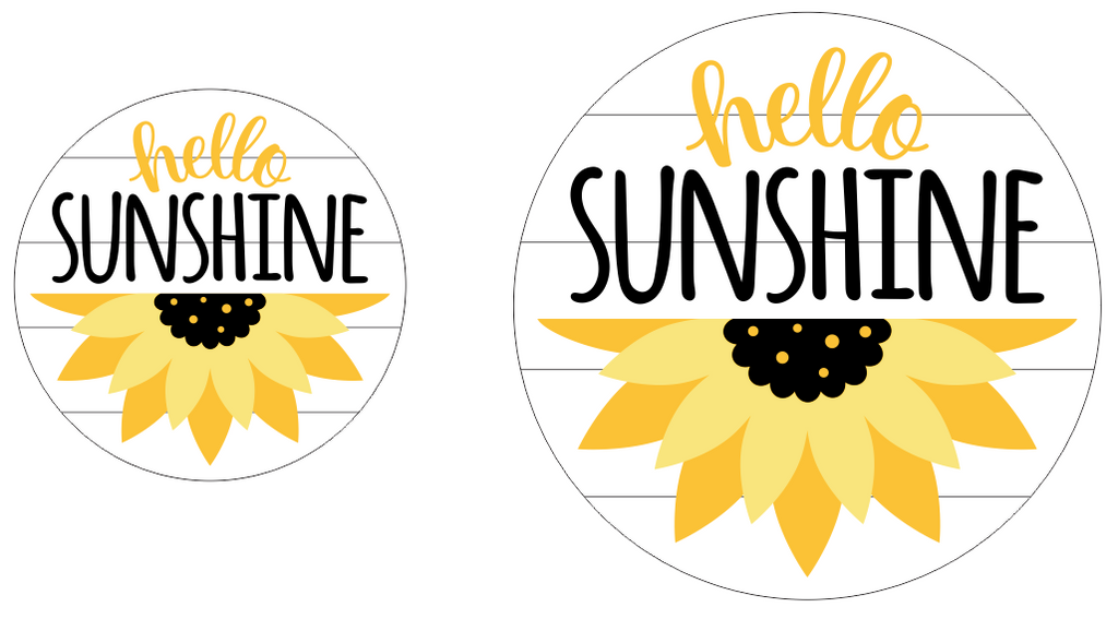 Design includes a 12 or 18" Pallet Round, laser cut words "hello SUNSHINE" and 3D layered sunflower.