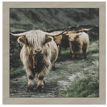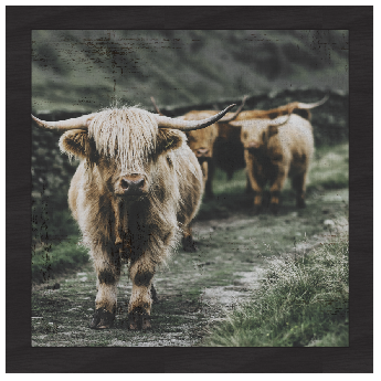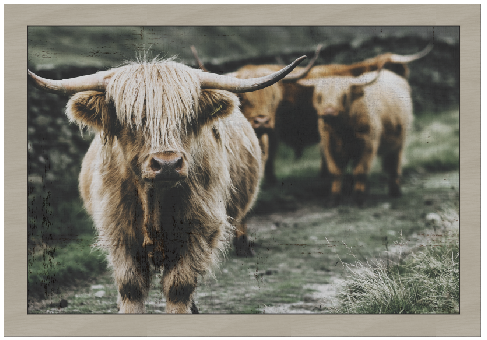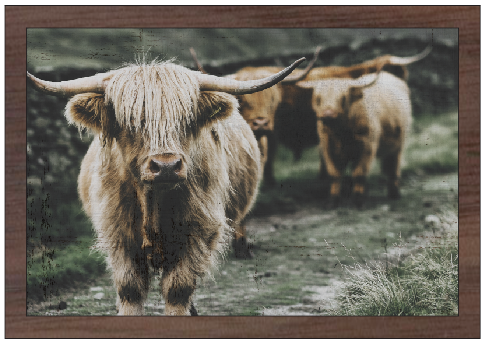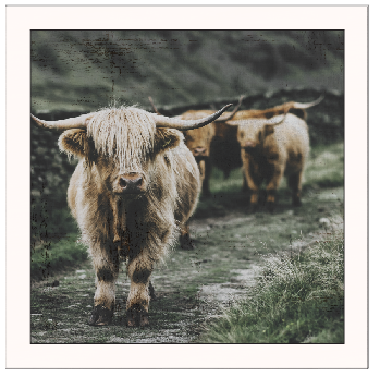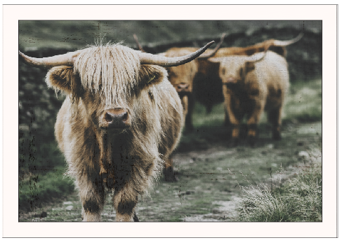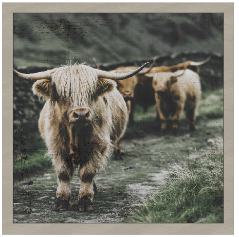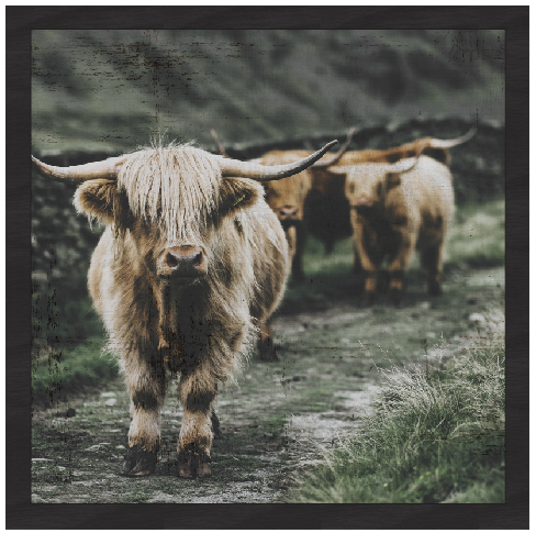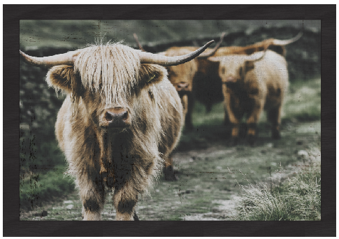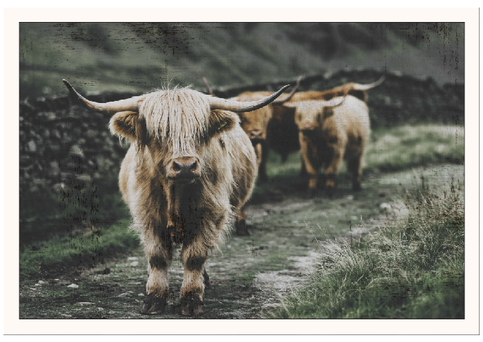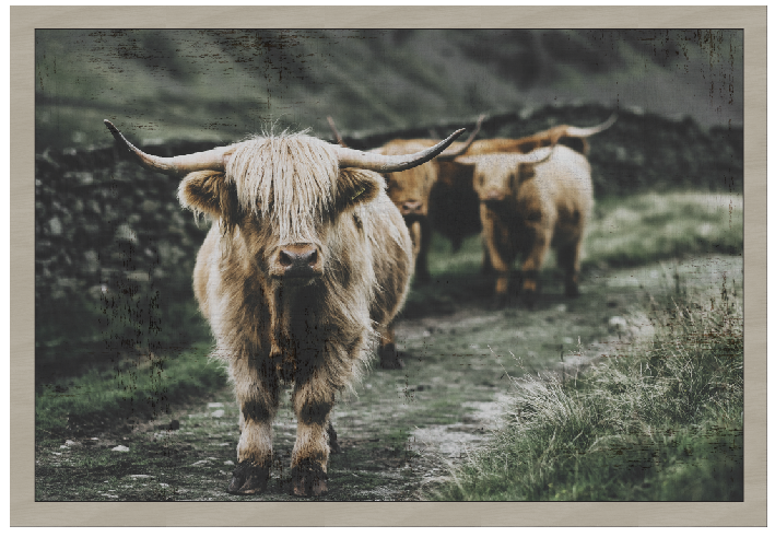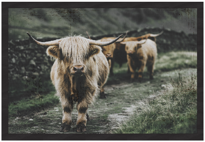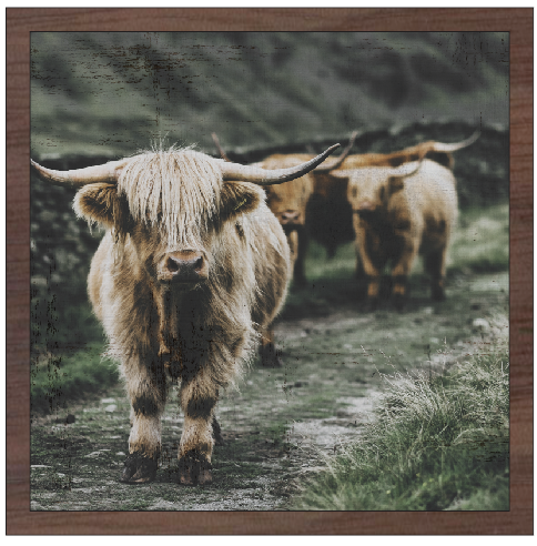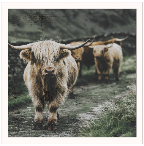 Highland Cow Trail Walk - Rustic Distressed Print. Available with your choice of Farmhouse Style Frames.