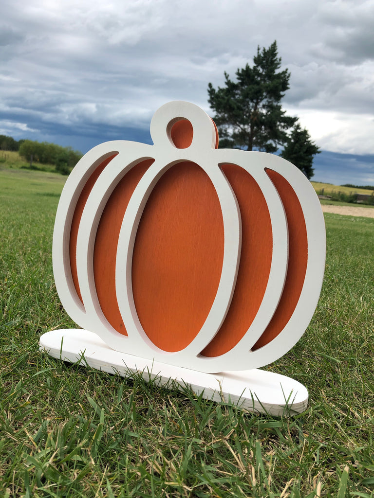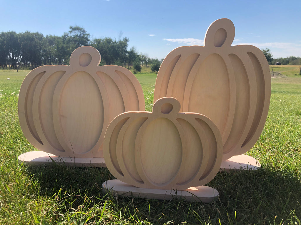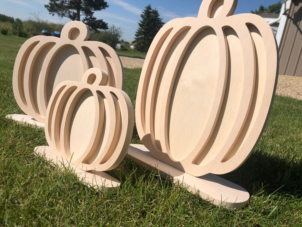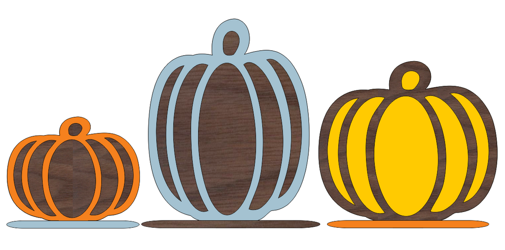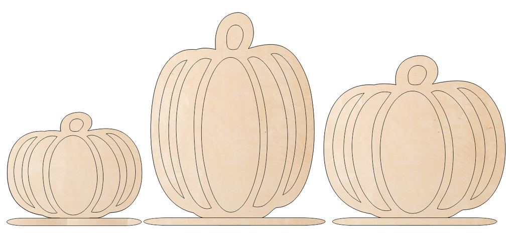 These Hollow-Style Pumpkins are so versatile - they can be decorated so many ways! The main pumpkin is cut from 1/2" Baltic Birch Plywood or MDF. A separate backer slides in behind it for a cool 3D effect. All set together on individual free standing bases.