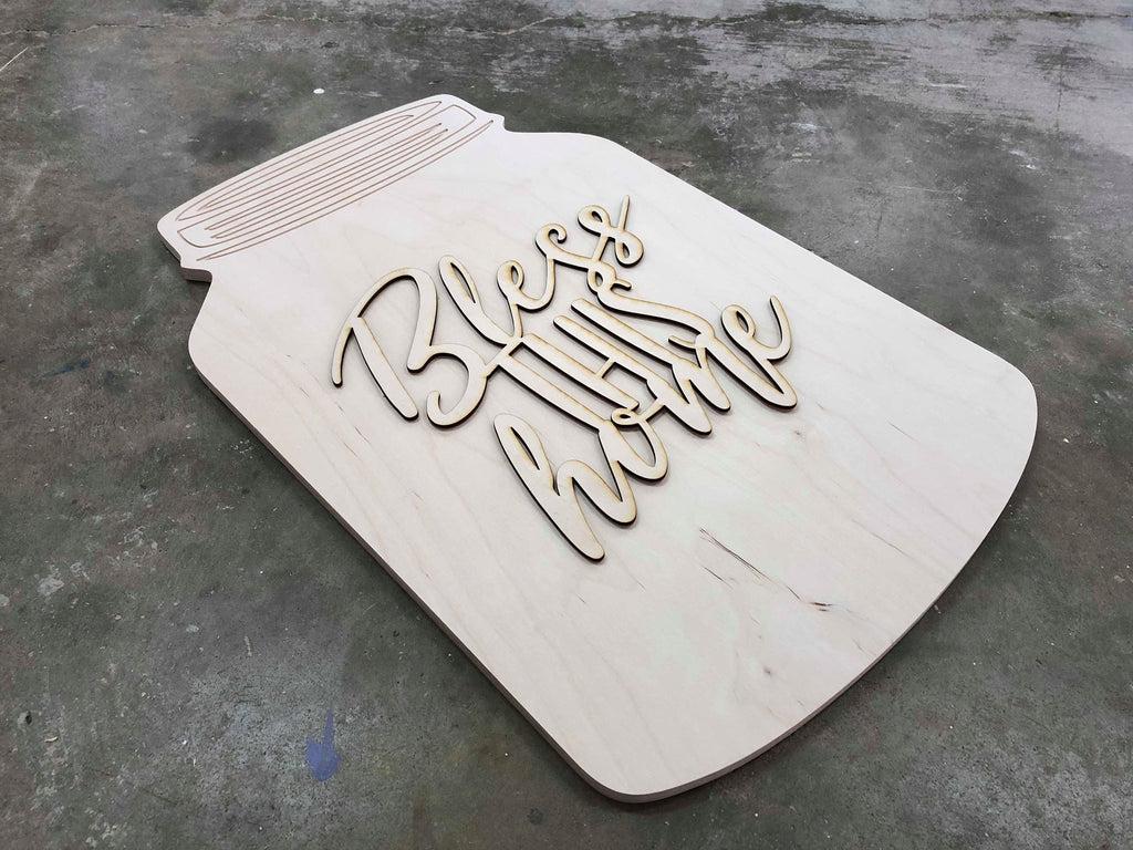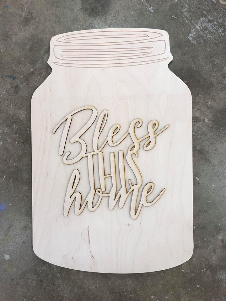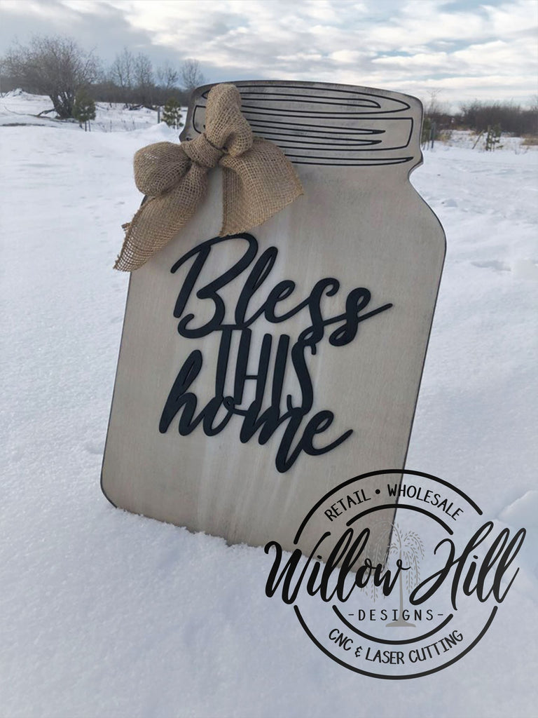 This mason jar is sized at 24" tall by 16" wide with carved lines in the top for easy finishing.  Add ribbon for a customized look, or decorate with one of our 1/8" Overlays.  (Shown with our 12.5x12.5" Bless this Home Overlay - sold seperately).