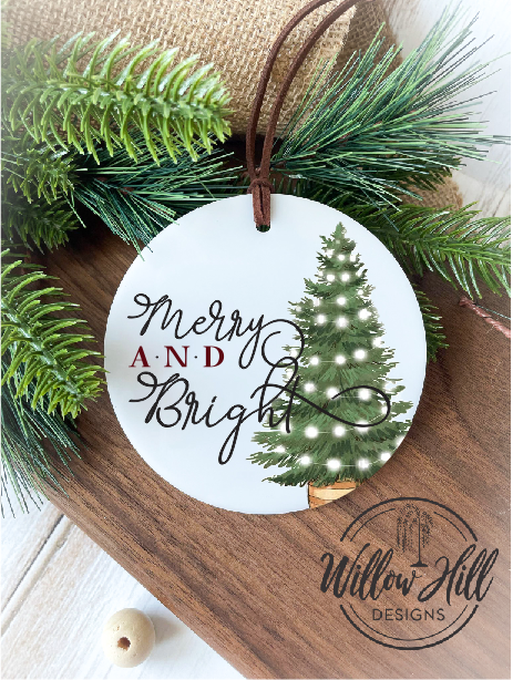 These ornaments are cut from 1/8" white acrylic and printed with permanent ink. Finished with brown or black suede string.