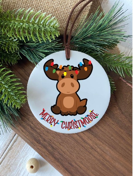 These ornaments are cut from 1/8" white acrylic and printed with permanent ink. Finished with brown or black suede string.