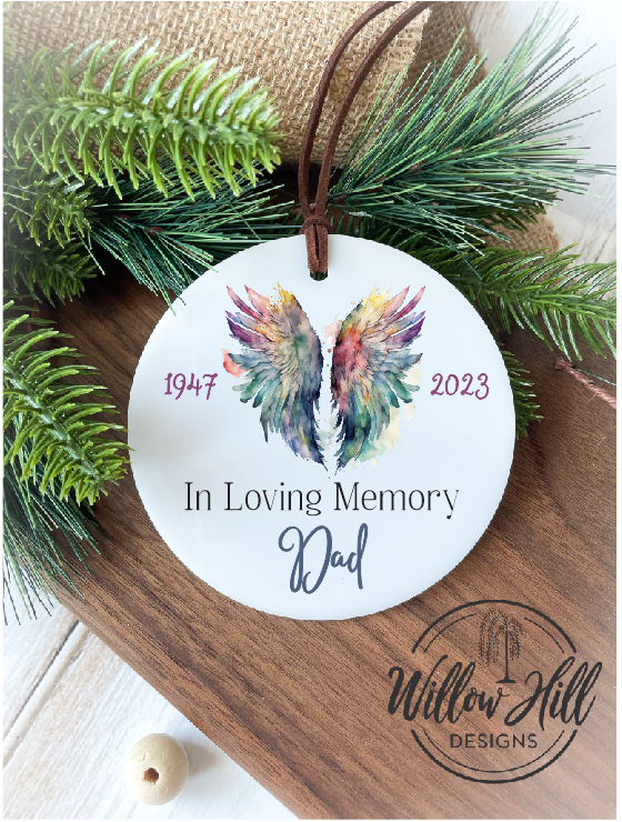 These ornaments are cut from 1/8" white acrylic and printed with permanent ink. Finished with brown or black suede string.