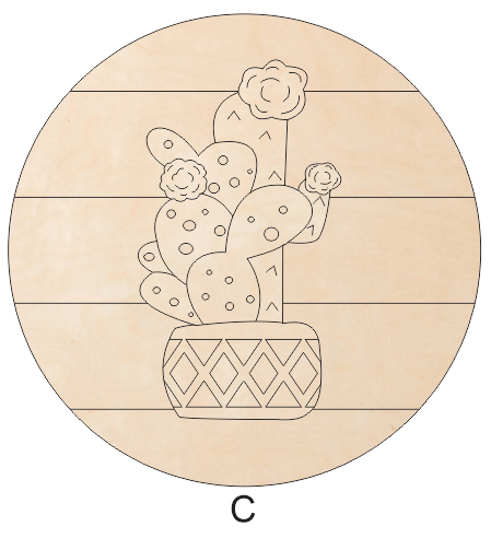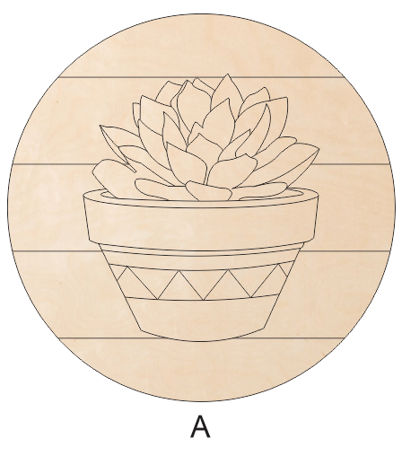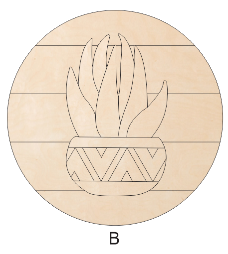 This trio of designs is available on 12" Pallet Rounds.  The 12" round is cut from 1/2" thick Baltic Birch Plywood or MDF.  Laser cut plant overlay is one single piece, with engraved lines to define the design.  Each design sold separately - choose from option A, B, or C.
