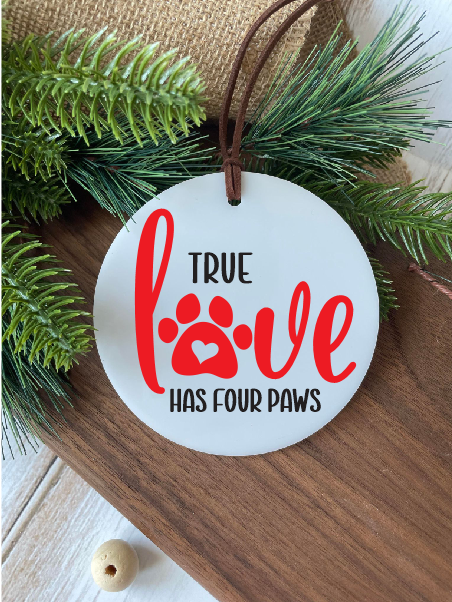 These ornaments are cut from 1/8" white acrylic and printed with permanent ink. Finished with brown or black suede string.
