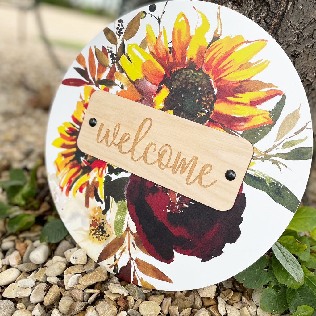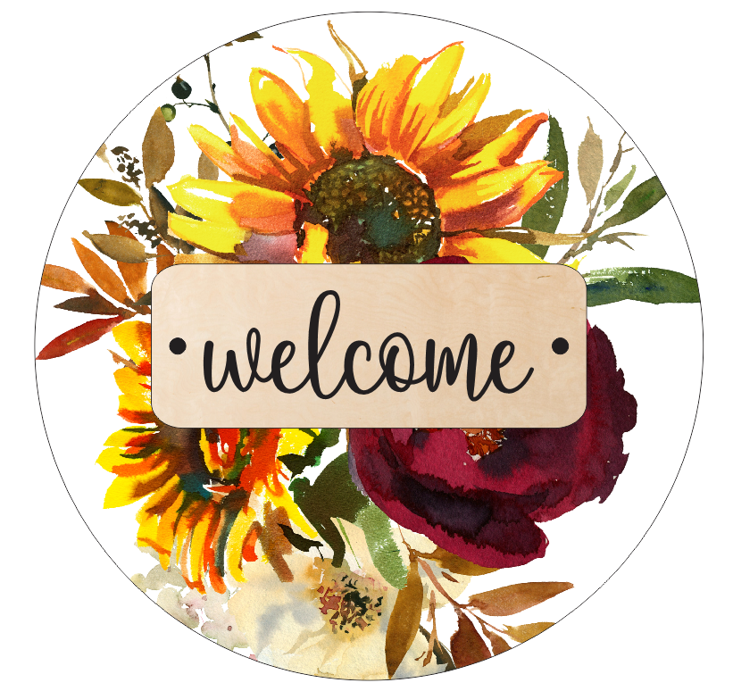 Welcome Round with Fall Florals and Sunflowers - with Wooden Plaque
