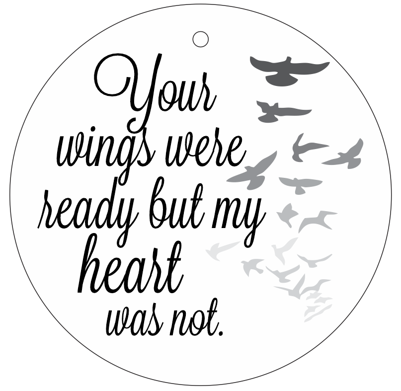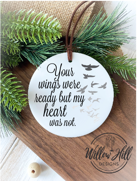 These ornaments are cut from 1/8" white acrylic and printed with permanent ink. Finished with brown or black suede string.